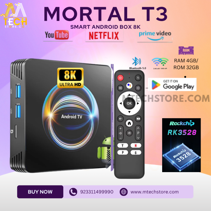 Upgrade your home entertainment system with the MORTAL T3 Android 13 Smart TV Box, now available at mtechstore.com. Designed for powerful performance and smooth streaming, this device easily converts your normal LED/LCD TV into a modern Smart Android TV.
