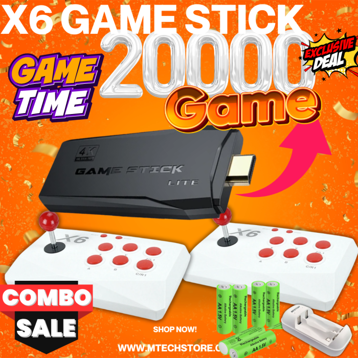 Now available on www.mtechstore.com, the X6 Game Stick comes preloaded with over 20,000 classic retro games, all packed into a sleek, compact, and plug-and-play design. Featuring dual wireless arcade joystick controllers, this console delivers an authentic arcade experience right on your TV.